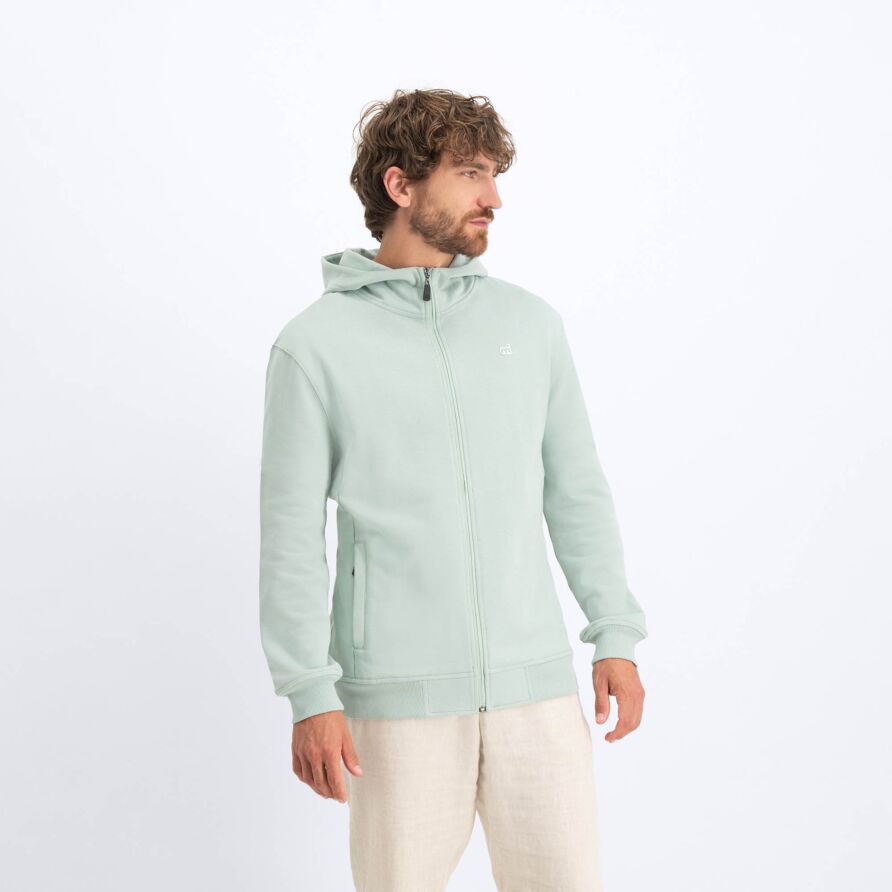 Our unisex Mistral light green fabric-coloured Cape Martin hooded, zippered sweatshirt is fabricated with a cotton polyester blend for durability, ease of care, warmth and comfort. It retains its shape and offers high perspiration absorption and breathability performance.