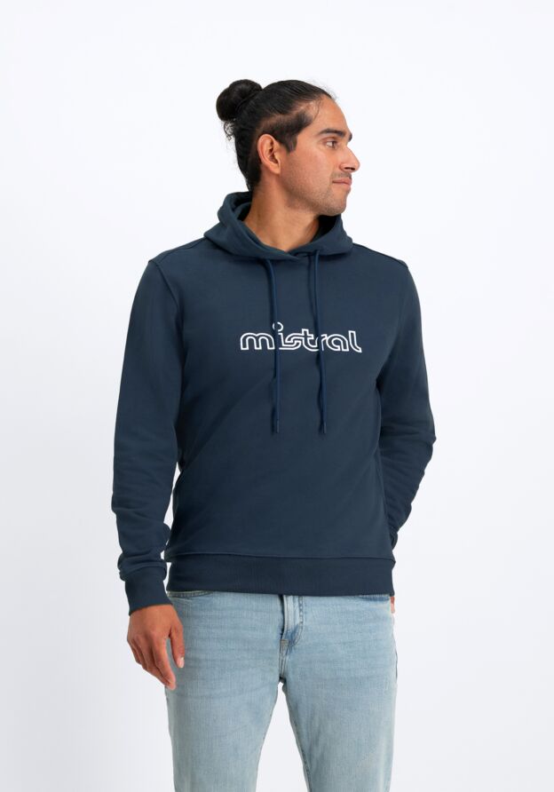 If you seek warmth in a casual garment, our dark blue fabric-coloured hooded sweatshirt offers supreme comfort and sweatshirt practicality for all seasons, with subtle Mistral branding.